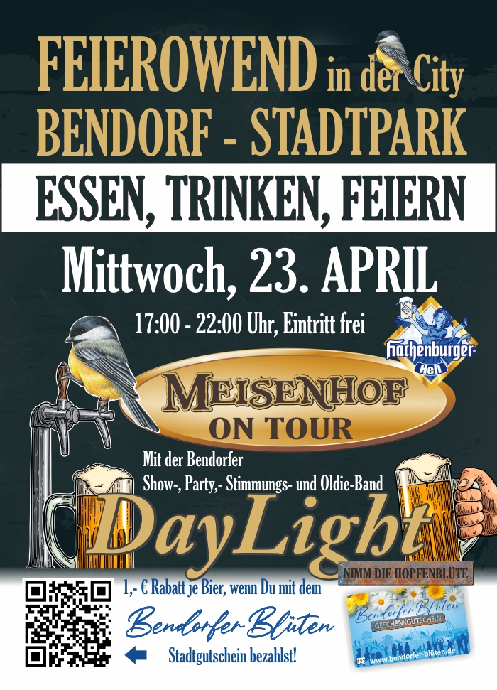 Zum „Feierowend in der City“ lädt der Meisenhof direkt in den Stadtpark. Unter dem Motto – Essen, Trinken, Feiern – erwartet euch Uwe Söhngen mit seinem Team mal nicht im Wald, sondern mitten in der Stadt, im schönen grünen Bendorfer Stadtpark.